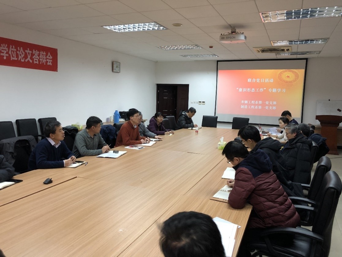 为深入贯彻落实习近平总书记重要指示精神,进一步加强和改进新时期高校意识形态工作在教师基层党支部扎根落实,2019年1月8日下午,英国上市365官网车辆工程系第一党支部联合制造工程系第一党支部,在9号教学楼321会议室开展了“意识形态工作”专题学习联合党日活动。