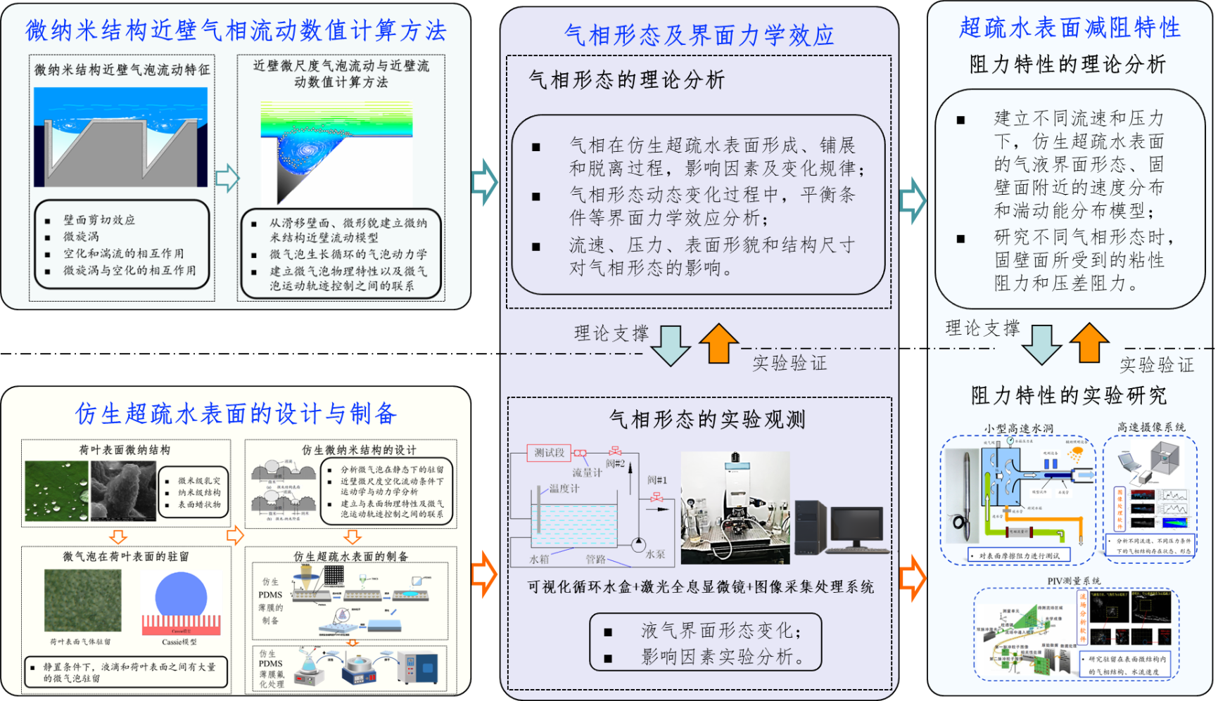 基于仿生超疏水表面的气相减阻技术,就是通过模仿荷叶等生物表面的超疏水特性,加工制备不同的超疏水表面,使得固体表面形成气相,从而以气固剪切来代替固液剪切,实现摩擦阻力的显著降低。针对动态的阻力特性,开展流场作用下气液界面演化过程研究,探究界面力学效应的仿生超疏水表面减阻机理,为获得长时间高效的水下气相减阻提供理论和实验依据。