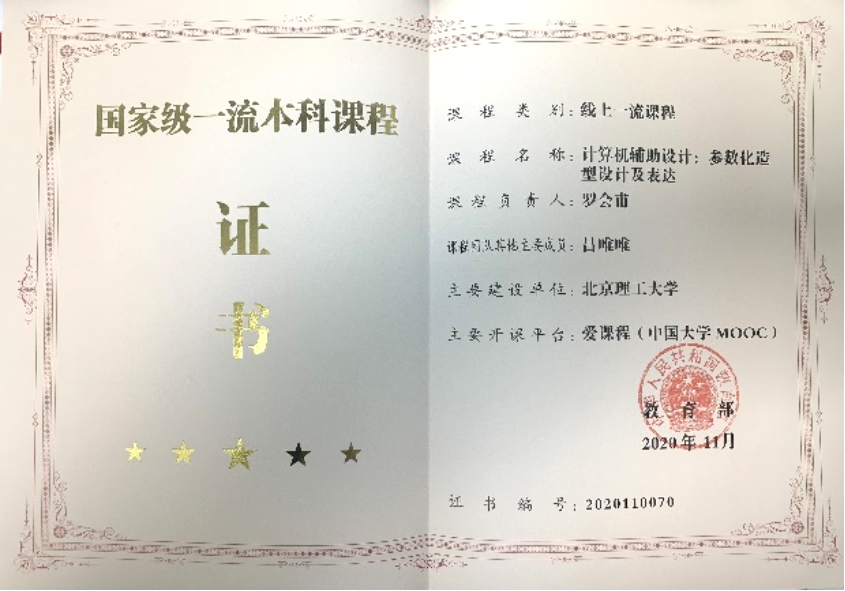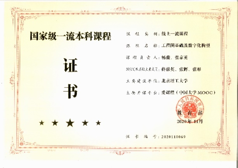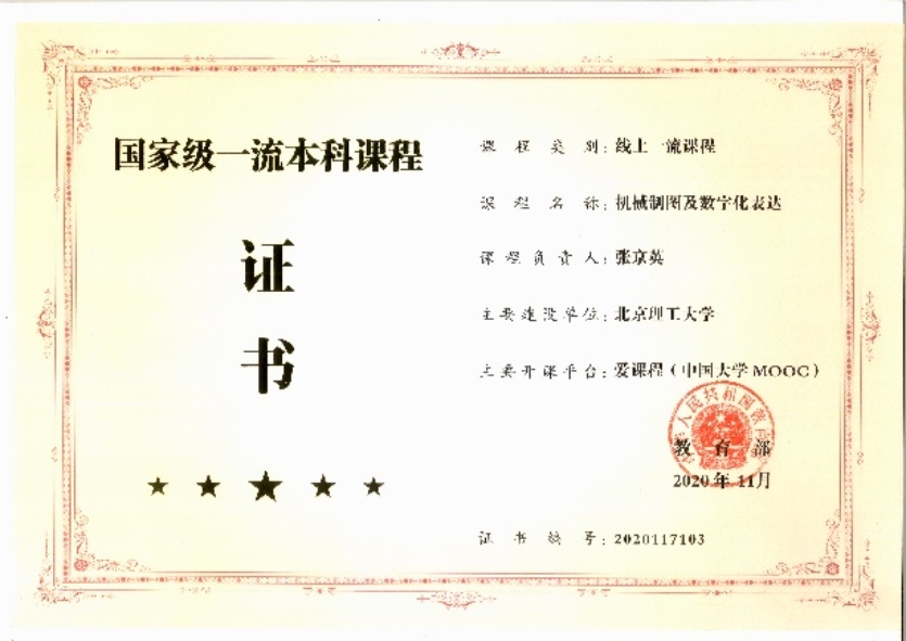 2020年,《机械制图及数字化表达》、《工程图基础及数字化构型》、《计算机辅助设计:参数化造型设计及表达》三门课程获教育部颁发“国家级一流本科课程”证书。