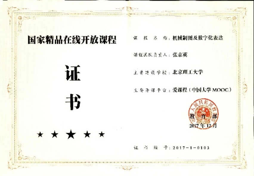 2015年,建成两门慕课《机械制图及数字化表达》、《工程图基础及数字化构型》并在爱课程平台上线,2017年《机械制图及数字化表达》慕课获国家精品在线开放课程。