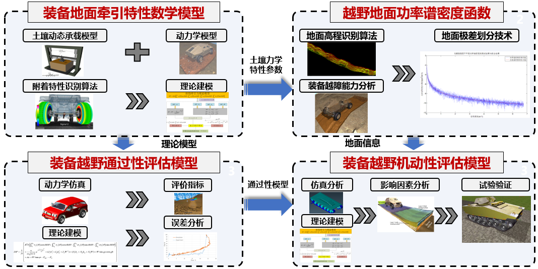 开展土壤动态承载模型研究,构建装备—地面牵引特性数学模型,利用地面级差划分技术,构建越野地面谱功率密度函数,明确装备越野通过、机动性的评价指标,构建装备越野通过、机动性评估模型。