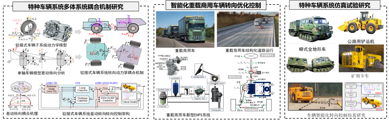 开展了特种车辆多体系统耦合机制研究、智能化重载商用车辆转向优化控制以及底盘一体化综合控制方法研究,开发了特种车辆转向控制算法与控制器。