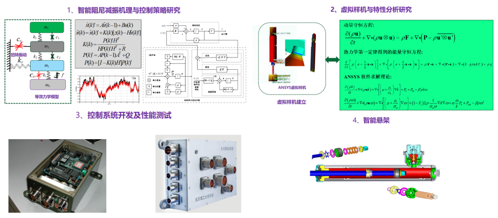 开展智能阻尼减振机理与控制策略、虚拟样机与特性分析、自适应智能悬架控制算法研究工作,开发了智能控制系统硬件并进行性能测试,实现可控悬架系统动力学性能提升。