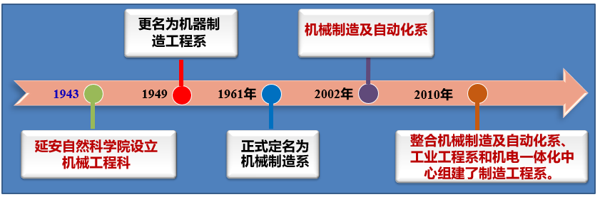 制造工程系,其前身可追溯到1940年延安自然科学院建院初期设立的机械工程科,诞生于抗日烽火之中、民族危亡之际,是延安自然科学院首开的五大科之一;1950年,调整为机器制造工程系;1952年,成为全国第一个兵工机械制造专业;1961年,更名为机械制造系,成为学校设立的七个系之一;1999年,更名为机械制造及自动化系;2010年,机械制造及自动化系、工业工程系、机电一体化中心进行整合,组建了制造工程系。