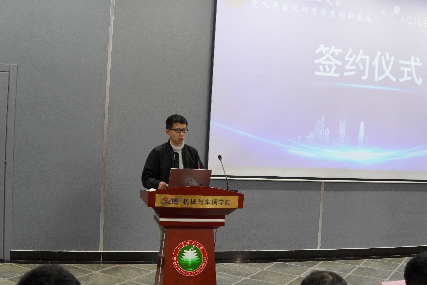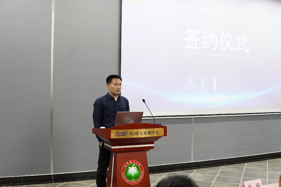 黄彪副院长代表英国上市365官网欢迎松灵机器人魏总等一行人员的到来,他介绍了英国上市365官网基本情况,重点介绍了学生创新创业方面取得的卓越成绩,强调学校的工程教育和改革离不开各个企业的介入与支持,希望通过与松灵机器人的校企合作能够在多维度取得更大的成果。