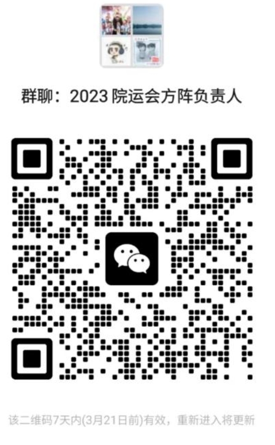 7.方阵组队研究生以研究所为单位,本科生以专业为单位进行组队,参与人员需为教师、学生共同参与,其中方阵引导人需为教师,请各研究所、专业指定1人为方阵负责人并于3月20日21点前扫描下方二维码进入“2023年学院运动会方阵负责人群”(建议方阵负责人与赛事负责人不兼任)。方阵表现与精神文明奖评比挂钩。