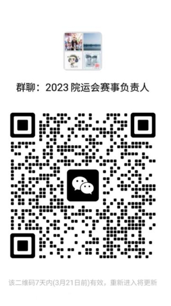 3.请以班级为单位推选班级运动会负责人(每班一名)并于3月20日21点前扫描下方二维码进入“2023年学院运动会赛事负责人群”。