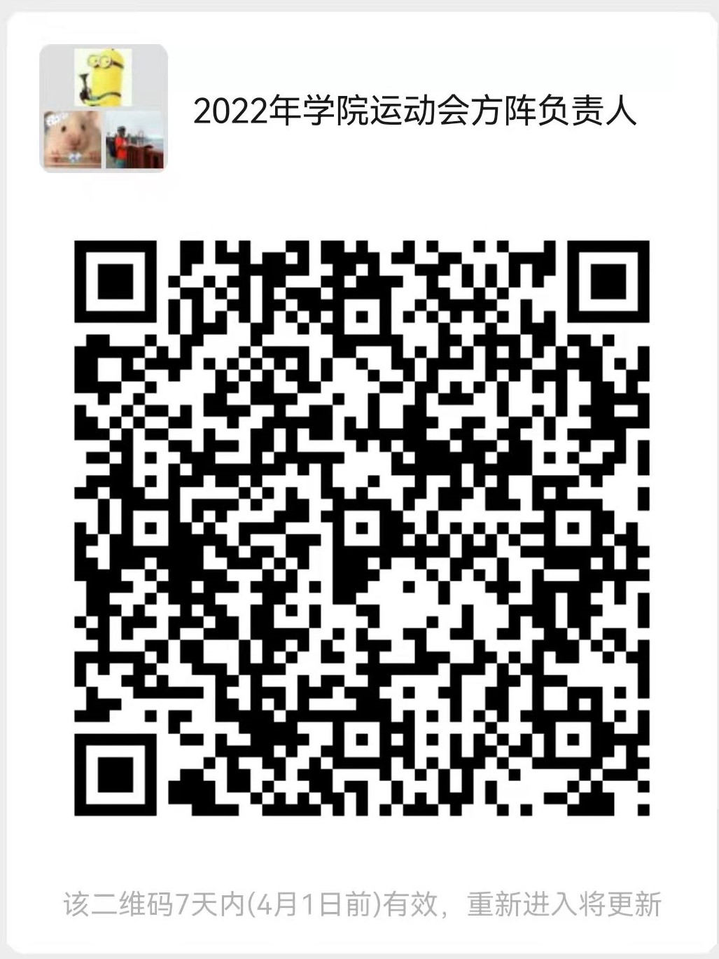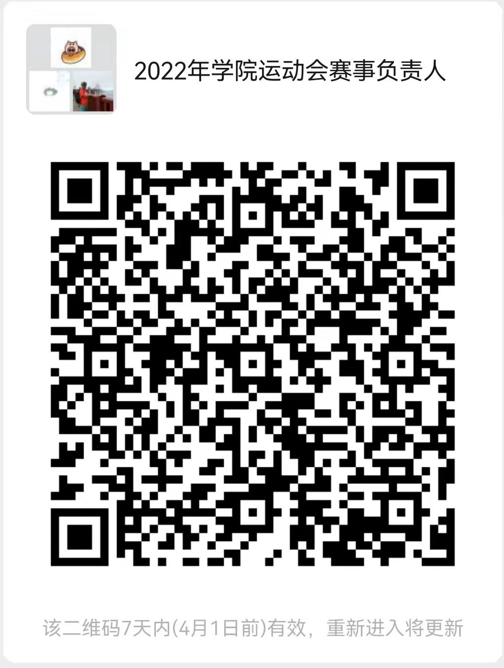 3.请以班级为单位推选班级运动会负责人(每班一名)并于3月28日21点前扫描下方二维码进入“2022年学院运动会赛事负责人群。”
