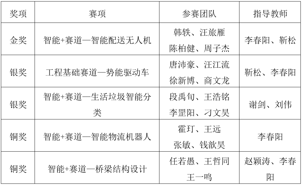 近日,由教育部、工业和信息化部、中国工程院主办,教育部工程训练教学指导委员会举办的2021年中国大学生工程实践与创新能力大赛全国总决赛榜单揭晓(原“全国大学生工程训练综合能力竞赛”,以下简称“工创赛”)。我校学子斩获1项金奖、2项银奖和2项铜奖的佳绩。本届全国总决赛共有来自267所高校、601个团队的2404名学生入围,我校5支参赛队分别参加了智能配送无人机、势能驱动车、生活垃圾智能分类、智能物流机器人和桥梁结构设计等项目的角逐,最终荣获的奖牌总数刷新了历届来我校在此项全国比赛中的新纪录,同时也在全国各参赛高校中名列前茅。