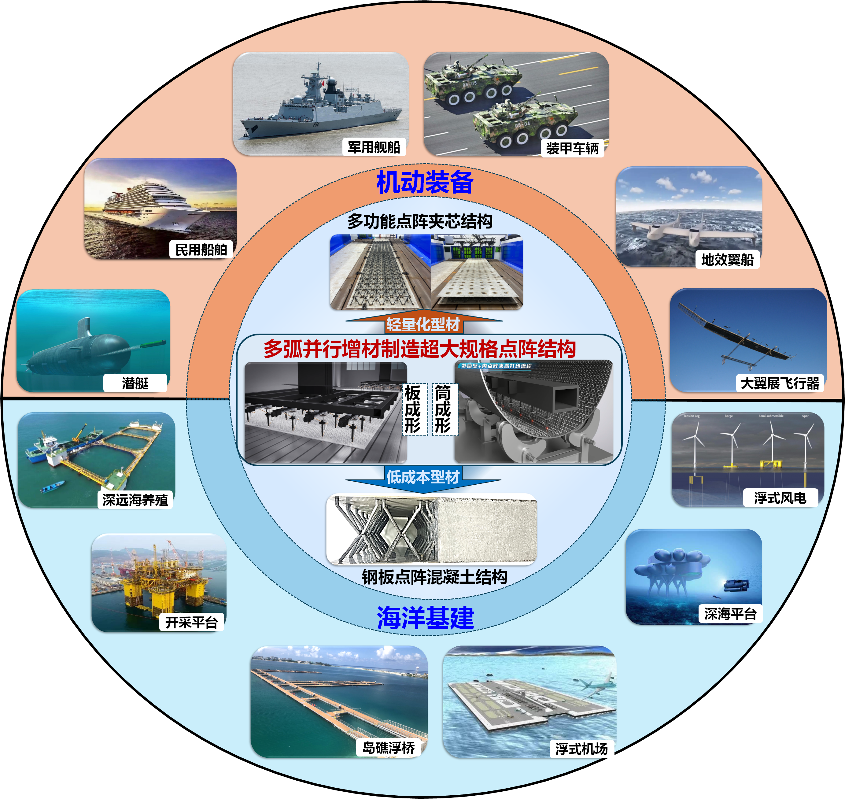 该技术旨在构建3D打印可批量化生产的两类点阵“型材”。一类是轻量化型材,暨轻质多功能点阵夹芯结构,相对传统结构可减重30%以上,兼具减振降噪、抗爆防护等功能,适用于机动装备,在船舶、潜艇、装甲车辆、大翼展飞行器等领域具有广阔应用前景。第二类是低成本型材,暨钢板点阵混凝土结构,内部填充低成本混凝土,是一种新型海洋基建材料,相对现在全钢结构海洋平台,可显著降低用钢量,综合建造成本降低70%以上,兼具经济性、密封性、稳定性和安全性等,适用于非机动型海洋平台,在海洋浮式风电、深远海养殖、千米级海洋浮式平台、深海基地建设、岛礁建设等领域应用前景广阔。