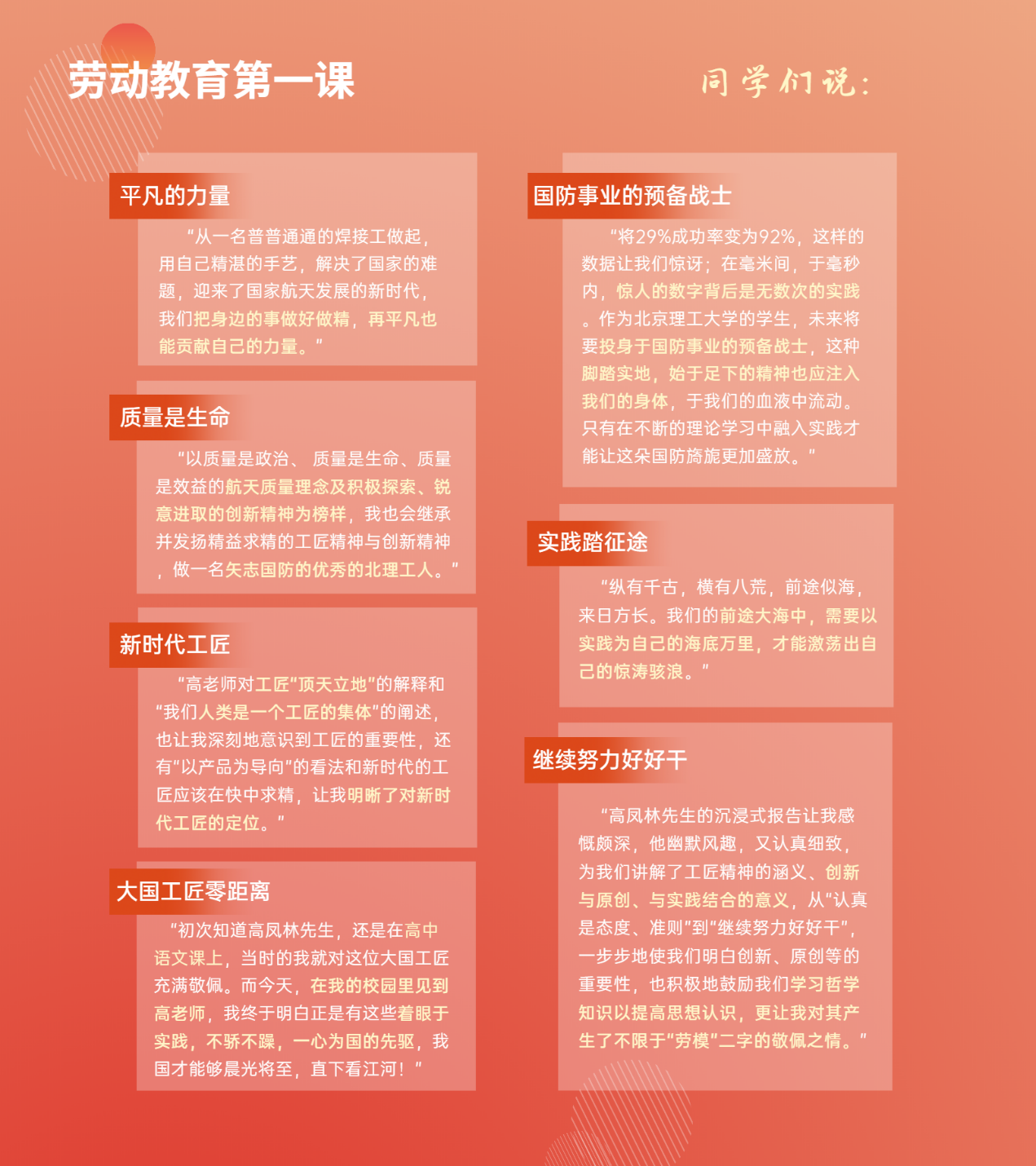 12月2日,课程特别邀请到全国劳动模范、大国工匠、航天科技集团第一研究院首席技能专家“中国火箭发动机焊接第一人”、全国总工会兼职副主席高凤林同志担任校外劳育导师,走进实验教学课堂,在良乡校区实训楼为新开课班级学生讲授“劳动教育第一课”。