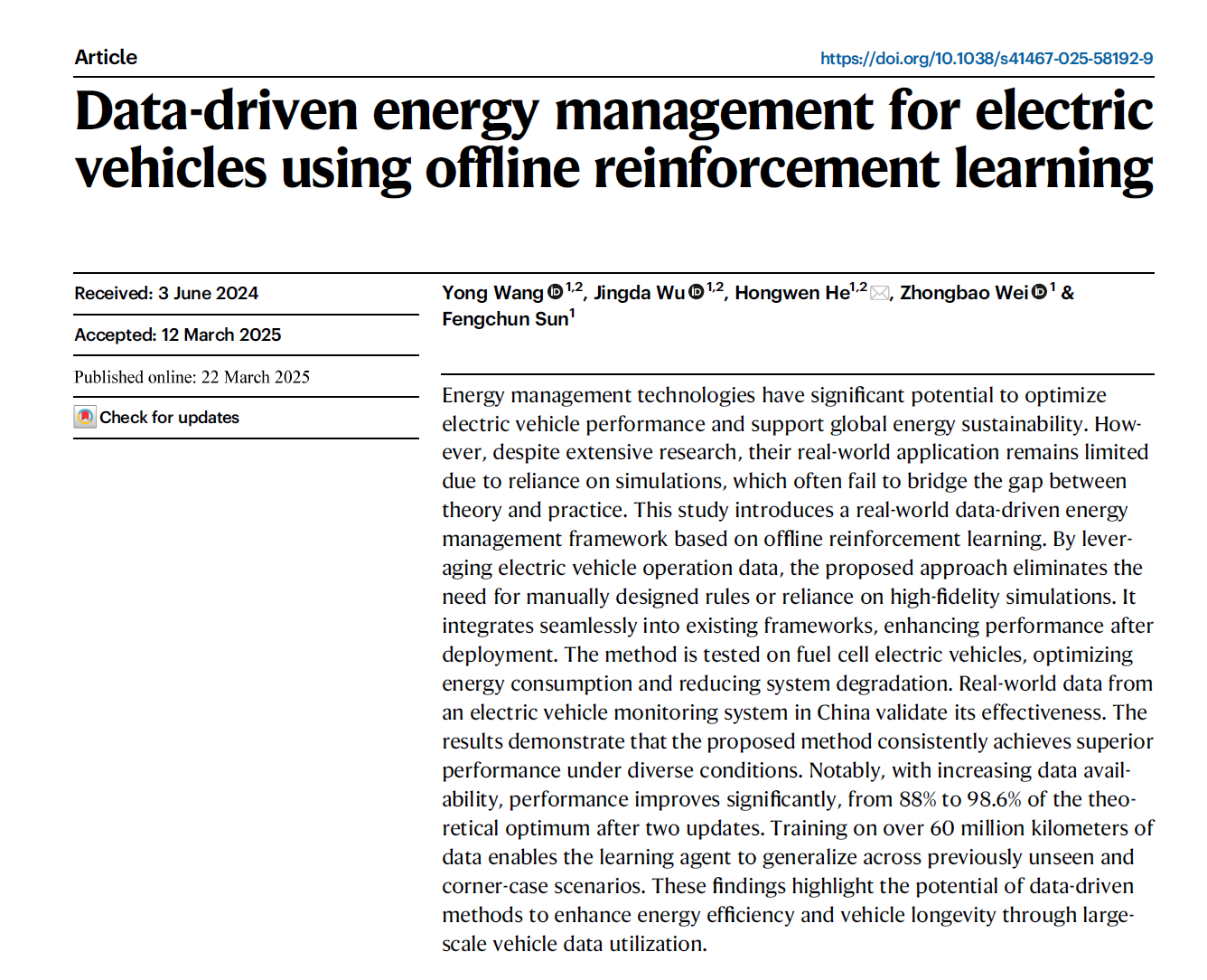 2025年3月22日,英国上市365官网孙逢春院士与何洪文教授团队在国际顶级期刊《自然·通讯》(Nature Communications)发表重要研究成果。该团队发表的题为《大规模数据驱动的电动汽车能量管理》(Data-driven energy management for electric vehicles using offline reinforcement learning)论文,突破传统由专业工程师设计控制策略的固有模式,通过利用电动汽车监测与管理系统采集的大规模运行数据,构建具备自主学习和持续进化能力的智能能量管理系统,为电动汽车大数据应用与控制系统开发提供了创新解决方案。